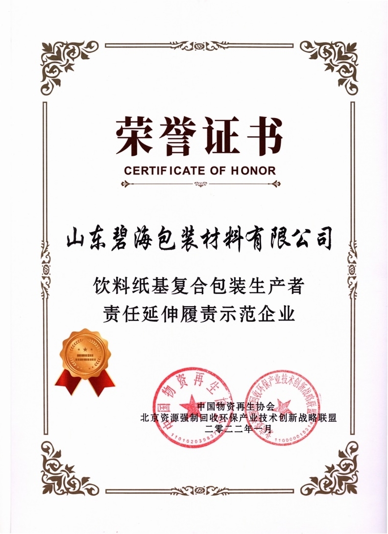 2022年1月12日,中國飲料紙基復(fù)合包裝可持續(xù)發(fā)展協(xié)作體2021年度會議在北京召開。會議對碧海公司在2021年推行環(huán)境友好包裝設(shè)計、開發(fā)可再生原料包裝、共建飲料紙基復(fù)合包裝回收協(xié)作體、規(guī)范回收利用等方面的工作給予了肯定,授予“飲料紙基復(fù)合包裝生產(chǎn)者責(zé)任延伸履責(zé)示范企業(yè)”榮譽(yù)稱號。
